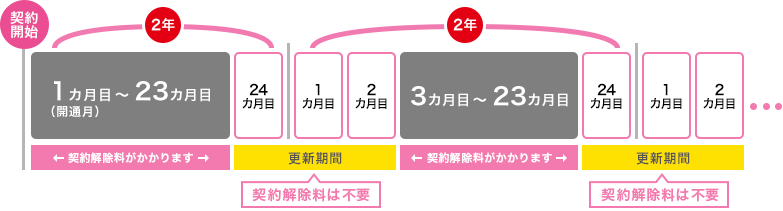 ※ 契約期間は2年間(課金開始月を1カ月目として24ヵ月目の末日まで)です。更新期間は24ヵ月目からの3か月間です。