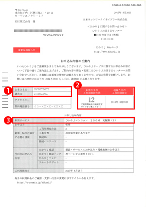 | 「お申し込み内容のご案内」への記載 | ひかりJ Web明細表示 | ||